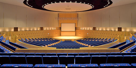 The Toyama International Conference Center is a central event facility for the city of Toyama (a regional hub city on the Japan Sea coast) and its surrounding region. The exterior is comprised of two layers - a glass curtain wall and a wooden lattice screen, which adds a sense of softness and warmth. The Main Hall seats 825; the diagonal seat layout creates unity and intimacy between the audience and stage area.